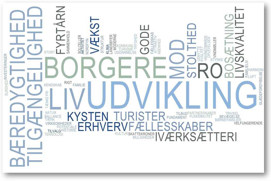 Ordskyen indeholder alle de ord, som borgere, foreninger og erhvervsliv har brugt til at beskrive drømmene for fremtidens Nordfyn.